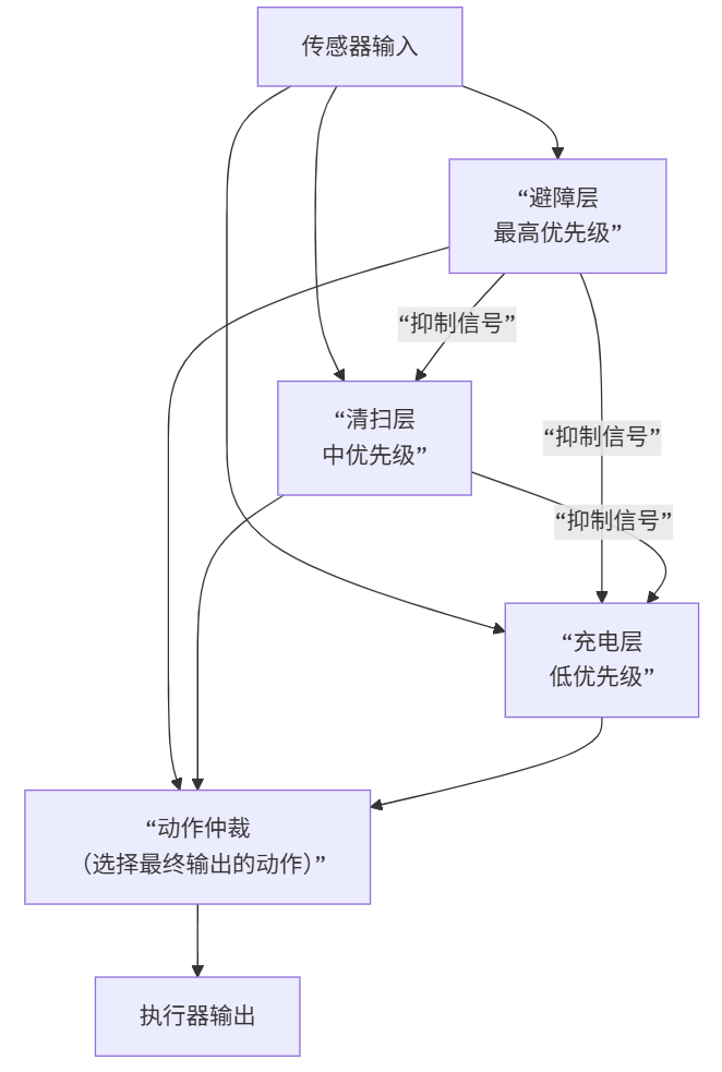 仲裁过程:当机器人正在清扫时(层二激活),如果突然前方出现障碍物,避障行为(层三)会立即抑制清扫行为(层二)的输出,让机器人先转向。避开障碍物后,避障行为条件不再满足,清扫行为重新取得控制权,这保证了机器人的安全。