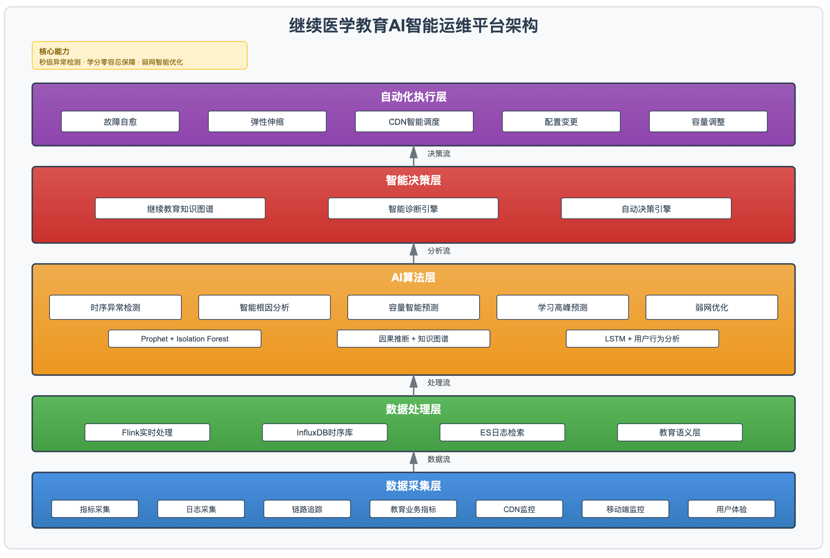 基于“感知-分析-决策-执行”的闭环理念,结合继续医学教育行业特殊性(学习时段集中、学分零容忍、基层网络差、移动端为主),我们设计了一套企业级AI智能运维平台,架构分为五层: