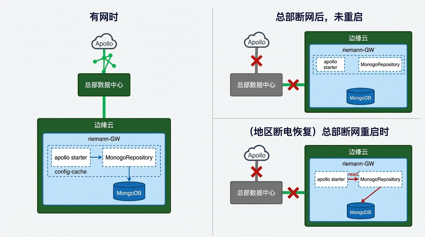 配置中心(如 Apollo、ZK 或 Nacos)通常部署在总部集群,因此极易受到地区网络中断的影响,导致应用启动时出现不可预知的问题。为此,我们的策略是在网络正常时将所有必要的配置文件同步并存储在本地。一旦发生网络异常,系统将立即降级读取本地缓存文件,从而有效隔离网络波动对应用启动的影响,保障应用始终具备高可用性。