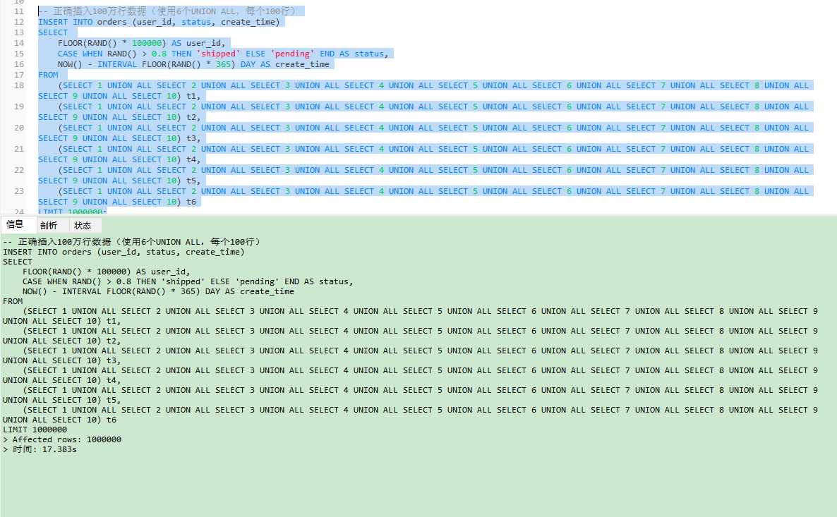 以下脚本创建包含 100 万行数据的测试表,模拟电商订单场景: