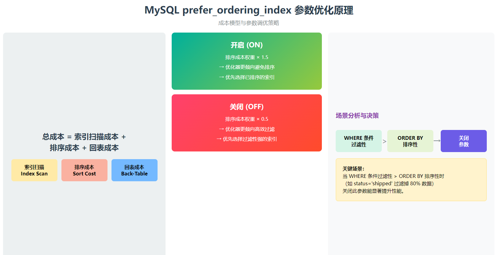 总成本 = 索引扫描成本 + 排序成本 + 回表成本prefer_ordering_index 通过调整排序成本的权重影响决策: