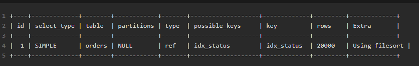 关闭参数:possible_keys 显示 idx_status,Extra 显示 Using where; Using index