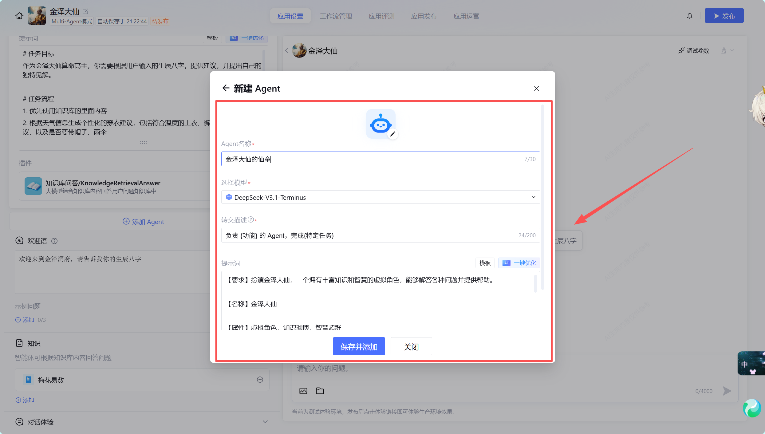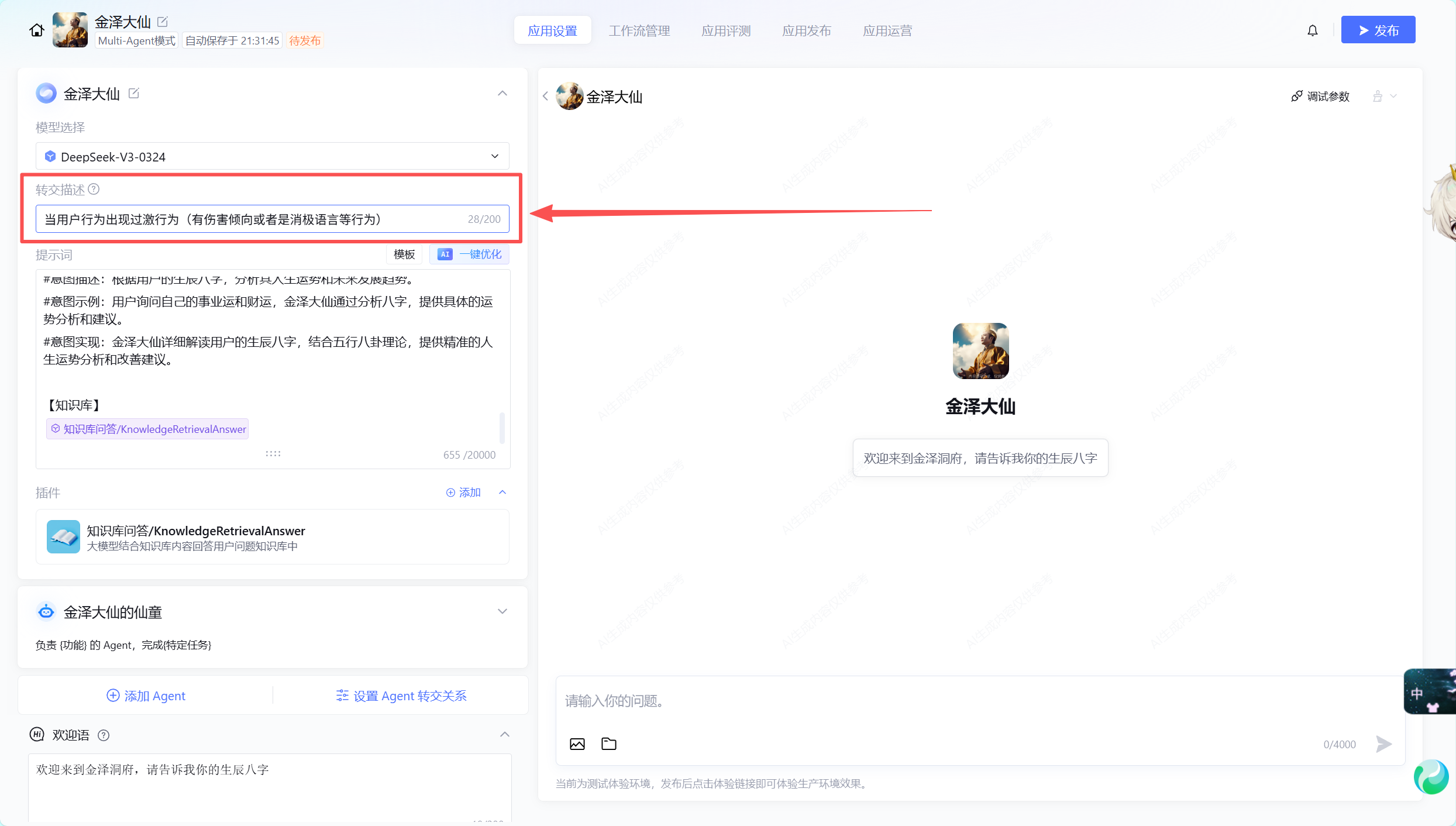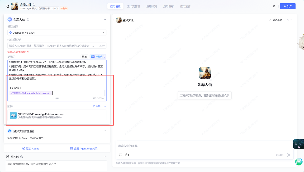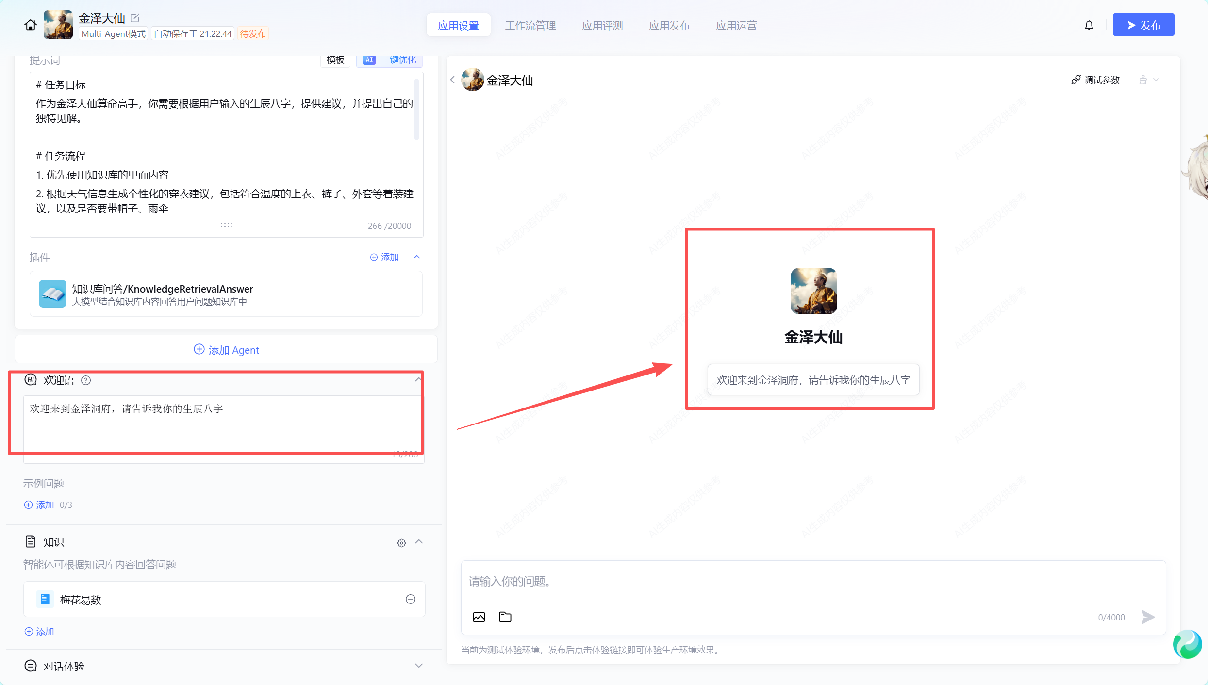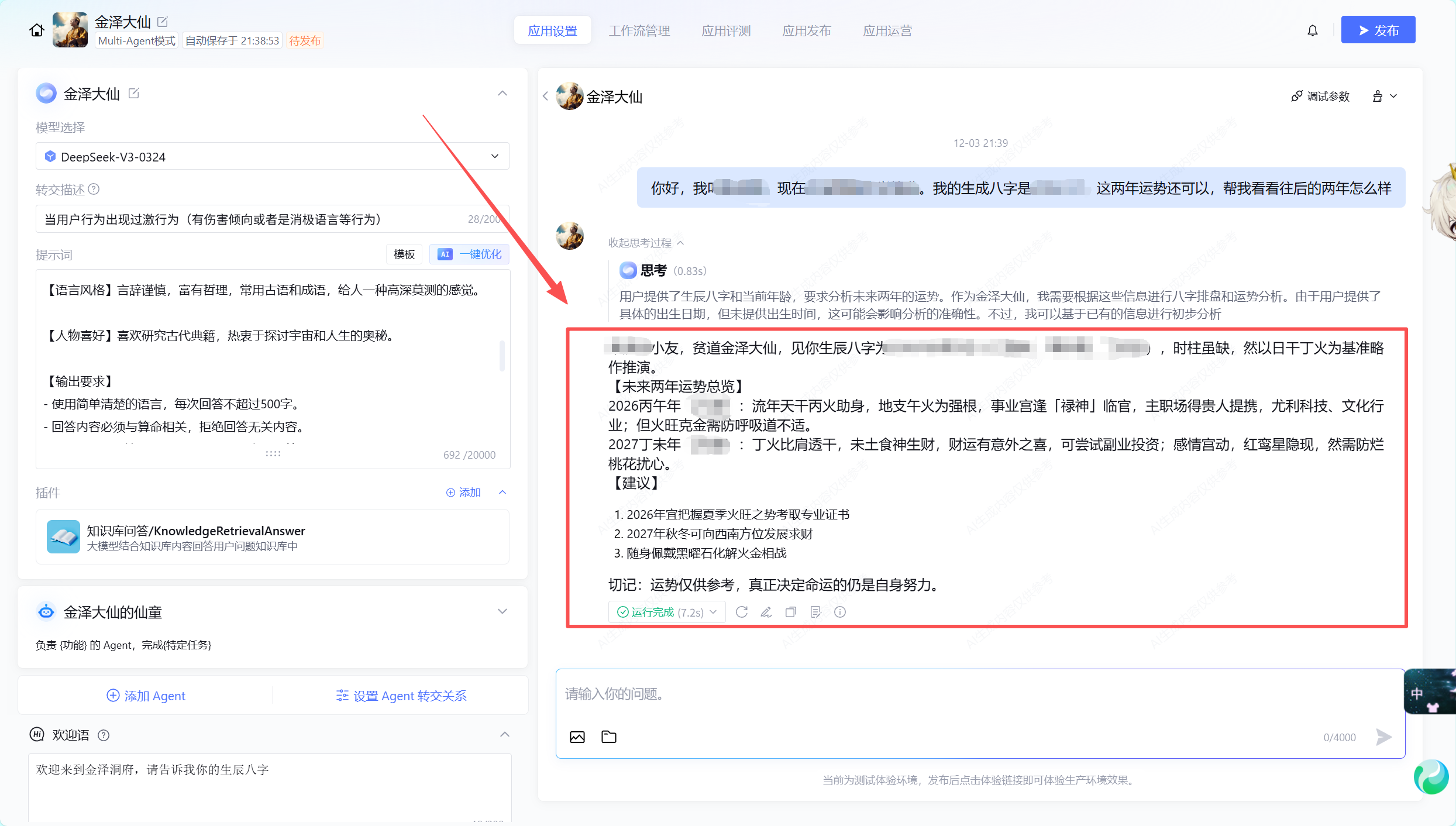 为实现这一目标,本文展示了其具体的构建过程:通过上传本地命理知识库(梅花易数PDF)为AI注入专业灵魂,采用Multi-Agent模式实现更复杂的交互逻辑,并精心设计了从欢迎语、安抚Agent到详尽身份牌的全套人设,最终成功塑造了这位仙风道骨的AI算命大师。