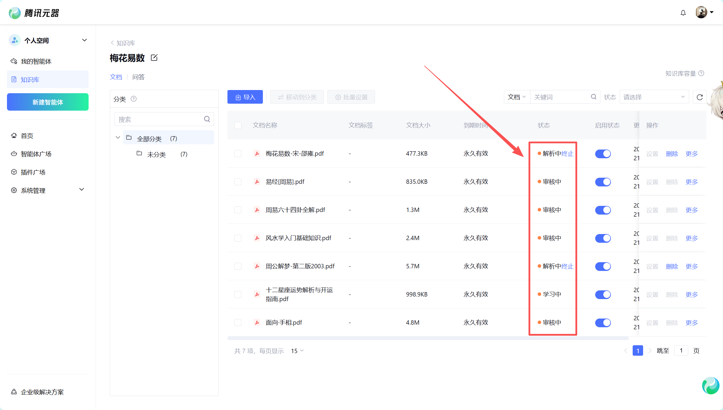 这里由于我上传的是本地文档pdf,所以这里会先解析,在审核,后学习,最终导入成功等几个状态。