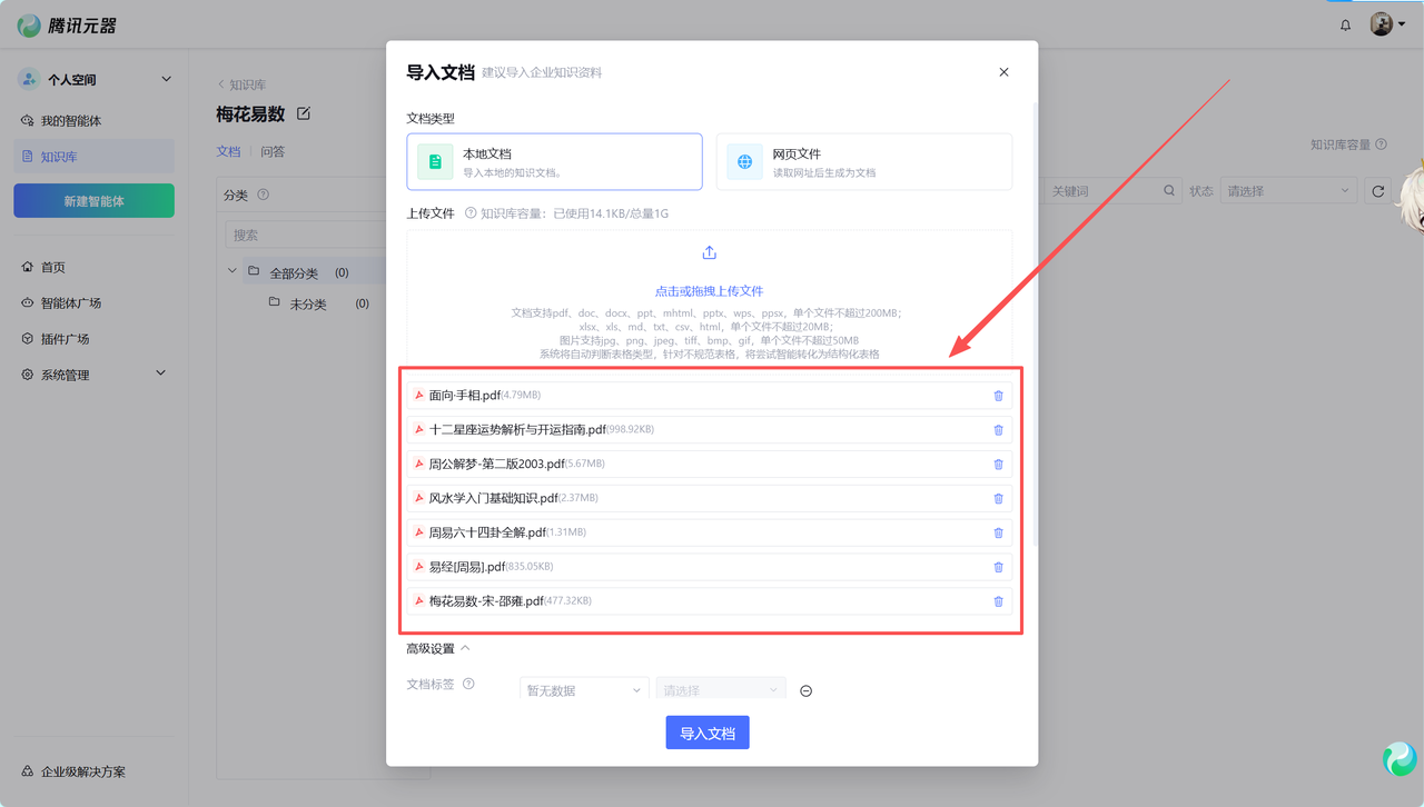 首先,是知识层面的构建,通过上传本地梅花易数PDF文档,为AI注入了专业的命理学知识,奠定了其“算命”能力的核心基础,使其回答有据可依。