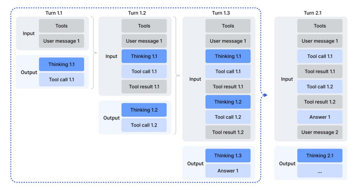 V3.2设计了专门针对工具调用场景的上下文管理策略:只有当新的用户消息加入对话时才丢弃历史推理内容;如果只是添加工具相关消息(如工具输出),推理内容会在整个交互过程中保留;当推理轨迹被移除时,工具调用历史和结果仍然保留在上下文中。