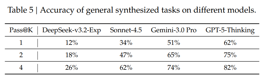 一个自然的问题是:合成任务是否足够有挑战性?随机抽取50个通用合成任务进行评测,V3.2-Exp只达到12%准确率,即使是顶尖闭源模型GPT-5-Thinking也只有62%。这表明合成数据确实包含了对当前最强模型都有挑战性的任务。