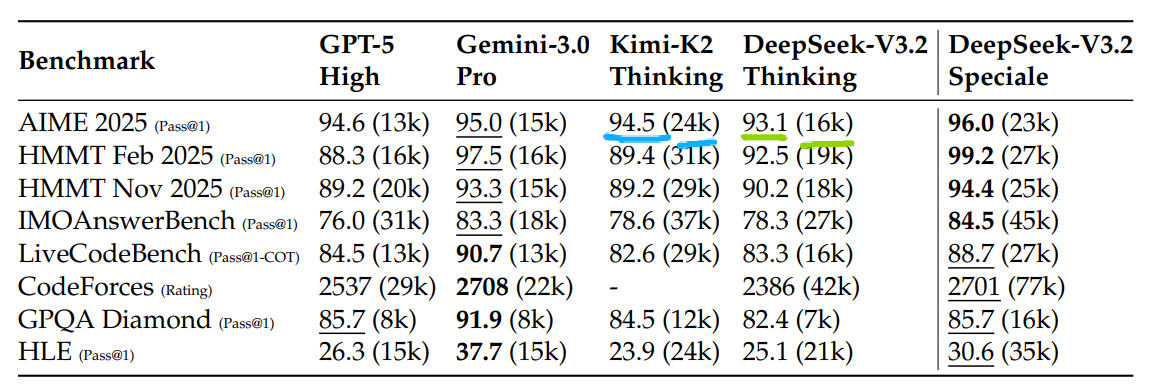 与Kimi-K2-Thinking相比,V3.2在输出token数显著更少的情况下达到了相当的分数。例如AIME 2025,K2-Thinking使用24k tokens达到94.5%,V3.2用16k tokens达到93.1%。