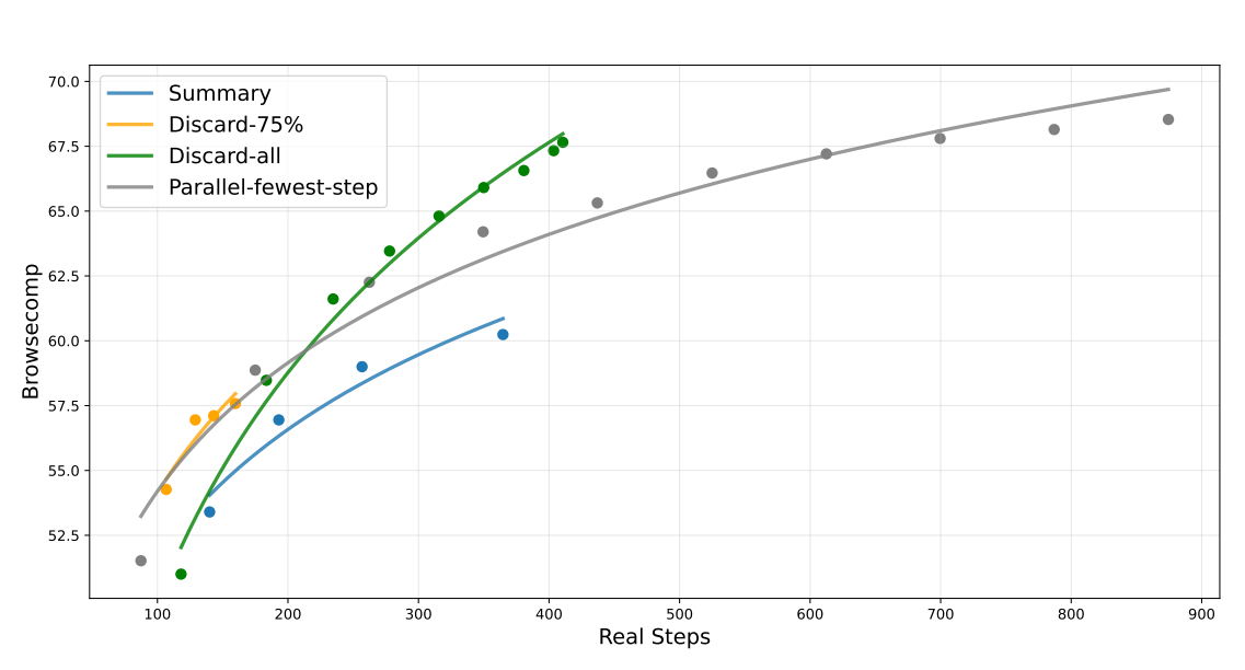 在BrowseComp基准上,Summary策略将平均步数从140扩展到364,分数从53.4提升到60.2。Discard-all策略在效率和可扩展性上表现最好,达到67.6分,与并行扩展相当但使用的步数显著更少。