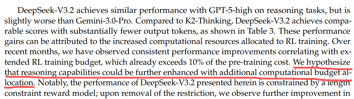 技术报告指出,V3.2的性能受到长度约束奖励模型的限制,这是为了在性能和成本之间取得平衡。移除这个限制后,性能还能进一步提升。