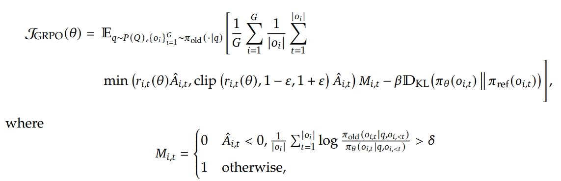 V3.2引入了一个二元掩码机制:当负优势样本的KL散度超过阈值时,将其从损失计算中排除。直觉上,模型从自己的错误中学习收益最大,但高度off-policy的负样本可能产生误导,反而损害优化过程。