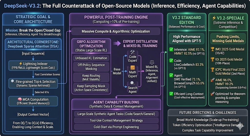 2025年12月1日,DeepSeek发布了正式版V3.2及其高性能变体V3.2-Speciale。这不是一次简单的版本迭代,而是一次开源领域的重量级更新:开源大模型可以在推理能力、计算效率和Agent性能三个维度同时逼近甚至超越顶尖闭源模型。