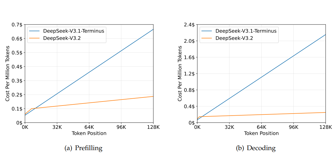 在H800集群的实测中,V3.2相比V3.1-Terminus在长上下文场景下实现了显著的成本降低。Terminus的每百万token成本几乎与序列位置线性相关,越靠后的token越贵;而V3.2的成本增长曲线要平缓得多,尤其是在序列后半段。