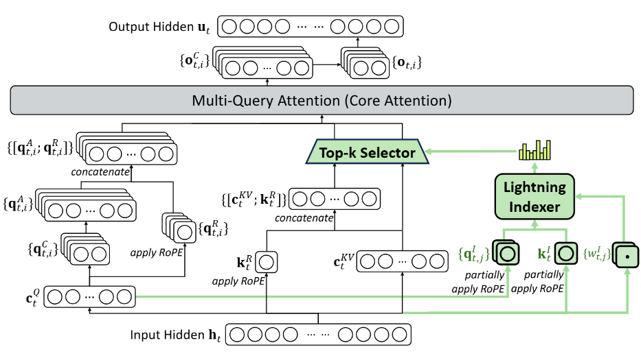 第二级是Fine-grained Token Selection(细粒度token选择)。根据索引器输出的分数,系统为每个query选出Top-2048个最相关的位置,然后只在这些位置上执行标准的MLA注意力计算:
