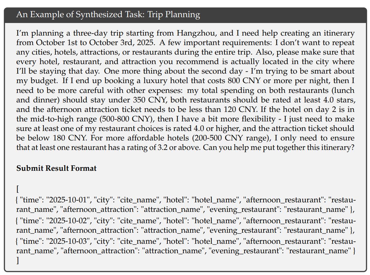 技术报告给出了一个旅行规划的合成任务示例,展示了这类任务的特点:搜索满足所有约束的方案很困难,但验证给定方案是否满足约束相对简单。