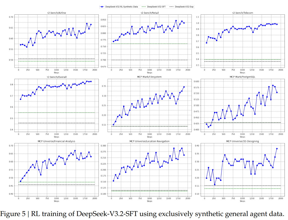 更重要的问题是:在合成数据上的RL是否能泛化到不同任务或真实环境?实验表明,在合成数据上进行大规模RL后,模型在Tau2Bench、MCP-Mark、MCP-Universe等基准上相比SFT checkpoint有显著提升;而如果只在代码和搜索场景上进行RL,这些基准上的性能并没有提升。这验证了合成数据的泛化潜力。