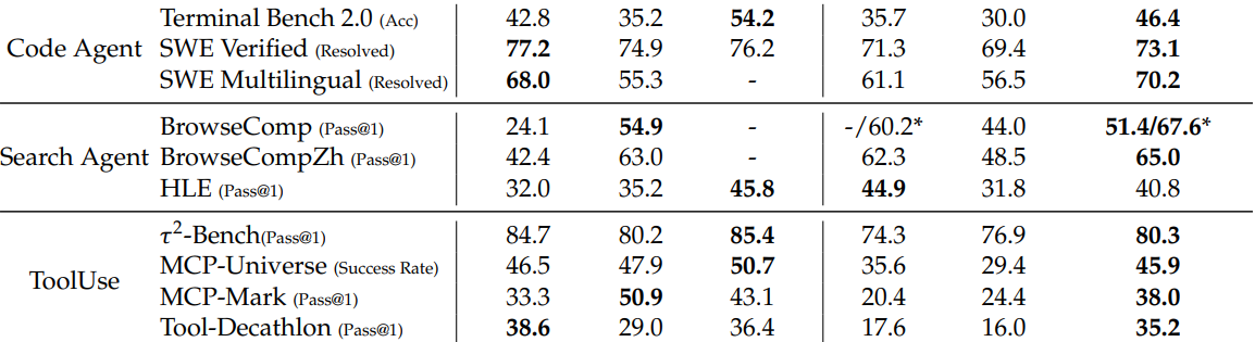 训练层面,可扩展的GRPO框架通过无偏KL估计、Off-Policy序列掩码、Keep Routing等技术,让RL训练能够稳定地吃上超过预训练10%的计算预算。这是开源社区在后训练投入上的重要突破。