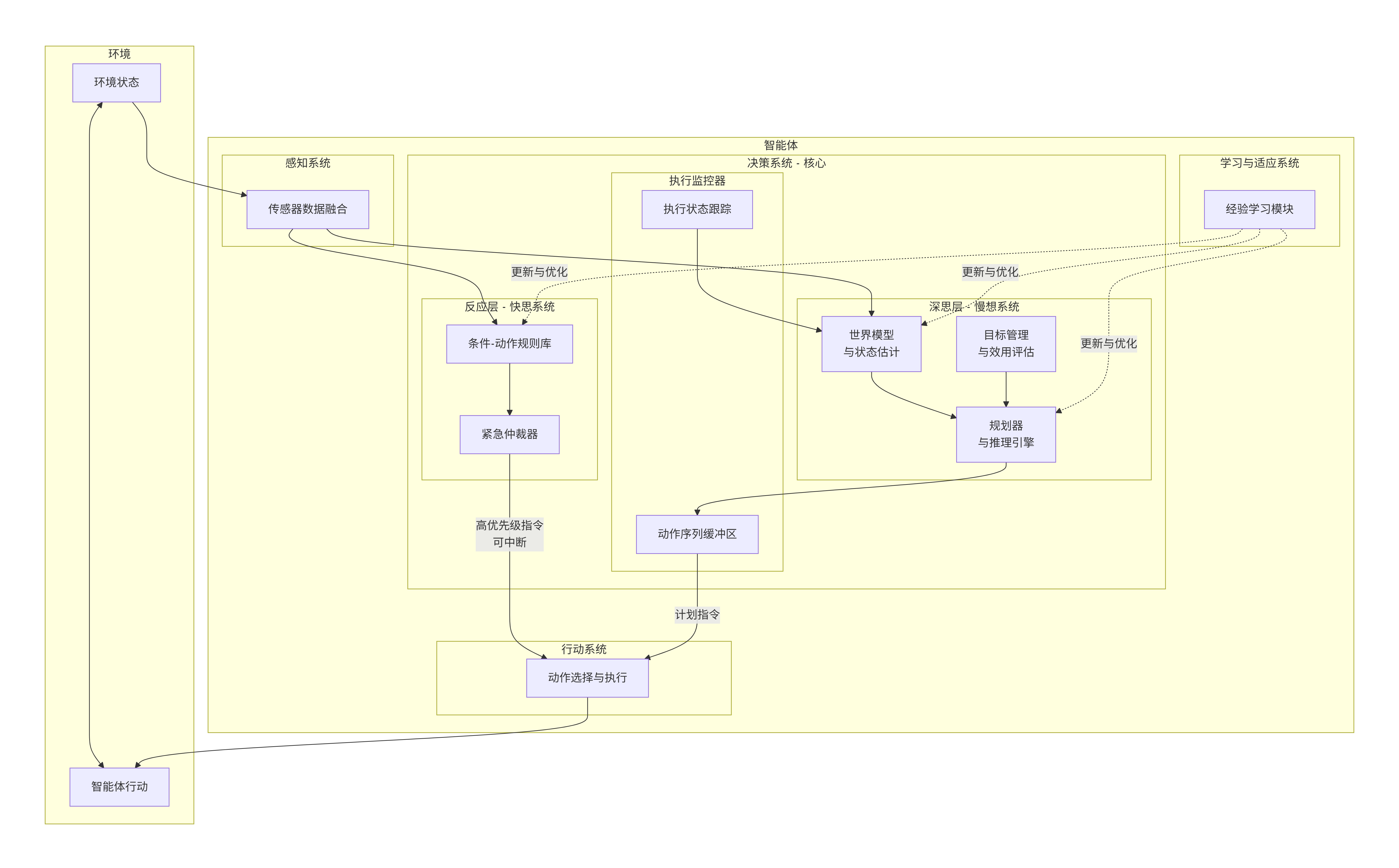 流程总结:该流程实现了反应速度与决策质量的平衡,并通过学习机制使系统能够持续优化,是构建自适应智能系统的比较有效的方式。