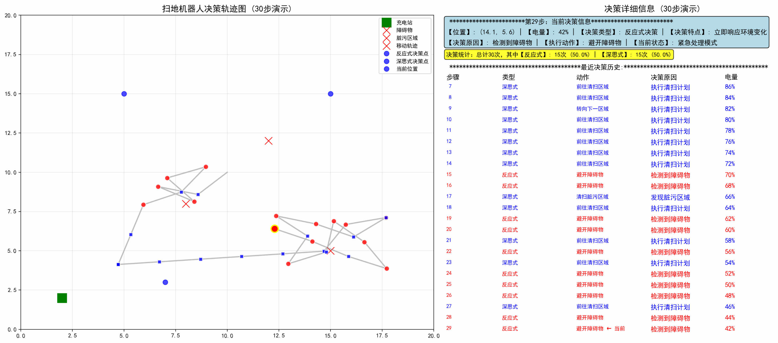 ====================================================================== 演示统计报告 (30步) ====================================================================== 总决策步数: 30 ? 反应式决策: 15 次 (50.0%) ? 深思式决策: 15 次 (50.0%) 剩余脏污点: 3 个 最终电量: 40% 最终位置: (12.3, 6.4) ======================================================================