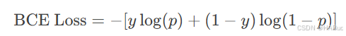 对象性损失 :对象性损失用于衡量每个预测框是否包含目标。YOLOv8 使用 二元交叉熵损失(Binary Cross-Entropy Loss, BCE Loss) 来计算对象性损失。 其中:y 是真实标签(1 表示有目标,0 表示无目标)。p 是模型预测的概率。