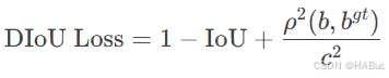 DIoU Loss 在 IoU 的基础上,增加了中心点距离的惩罚项。公式如下: