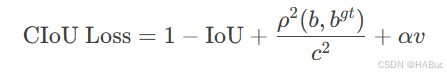 CIoU Loss 在 IoU 的基础上,增加了中心点距离和宽高比的惩罚项。公式如下:
