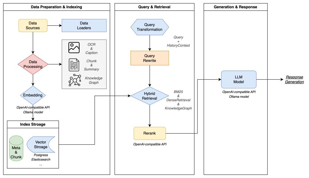 2. 模块化 RAG 流水线设计:支持自由组合检索策略、大语言模型与向量数据库。能够无缝集成 Ollama 等平台,灵活切换 Qwen、DeepSeek 等主流模型,满足企业知识库高效定制需求。