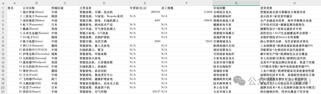 1. 我在Deepseek输入:"帮我整理家电行业排名前20的企业,包括公司名称、主营业务、年营收、员工规模、市场份额,以EXCEL表格的方式呈现,以HTML格式输出。网页需要有能直接下载EXCEL文档的功能,并且提供按钮能直接下载EXCEL文件到本地。"