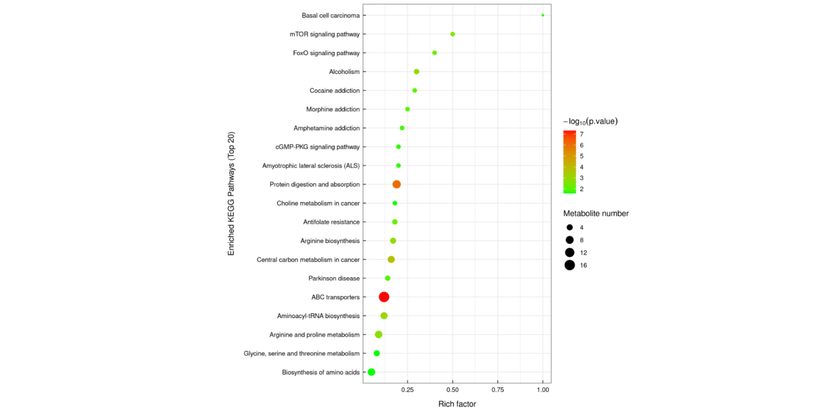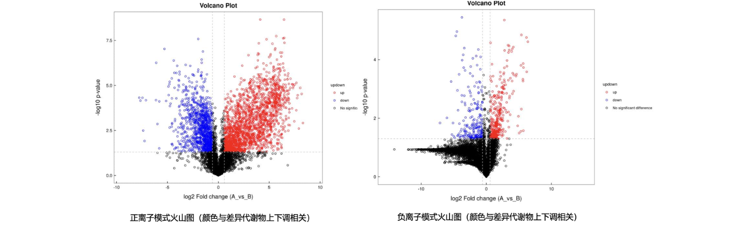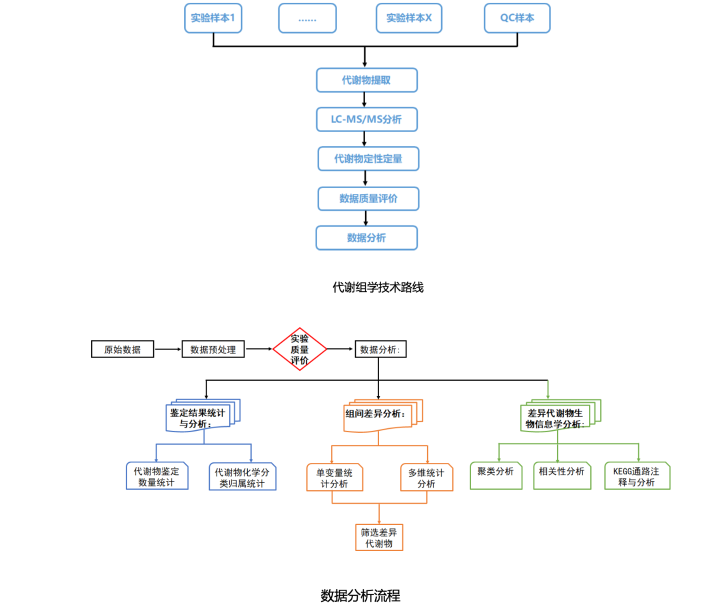 1.代谢组学概述 代谢组学(metabolomics)诞生于上个世纪末,是一门研究生命体对外界刺激、病理生理变化以及本身基因突变而引起的分子质量小于 1500Da 以内的代谢产物(内源性代谢物)种类、数量及其变化规律的科学。 代谢组学是继基因组学、转录组学、蛋白质组学后出现的新兴“组学“,是转录组学和蛋白质组学的延伸,能够更直接、更准确地反映生物体的生理状态,是系统生物学的重要组成部分。 系统生物学中,基因组学告诉你可能发生什么,蛋白组学告诉你正在发生什么,而代谢组学是最接近表型的组学,告诉你已经发生了什么。 目前代谢组学广泛应用于各研究领域。 通过代谢组技术分析实验组与对照组的代谢水平差异,找出差异代谢物,有助于生物标志物的筛选,或研究差异代谢物参与的生物过程(通过代谢通路逆推找出调节酶和基因),揭示其参与的生命活动机制,完成调控通路等方面的研究。 从检测方式上,代谢组学主要分为非靶向分析(untargeted)和靶向分析(targeted)两类。其中,非靶向分析模式通常是建立在高分辨质谱仪上(triple TOF 或 QE 系列等),依赖其强大的高分辨率质量分析器,能够对样本中的各类代谢物进行无偏向、大规模、系统性的检测,提供的是"航拍"的视角,最大程度反映生物体内的代谢水平扰动情况,因此适合项目前期的基础研究;而靶向分析模式通常是建立在单位质量分辨率的质谱仪上(Q-Trap、QQQ 等),依赖于三重四极杆串级质谱的高选择能力及高灵敏度,使用针对性开发的样品制备及色谱分离方法,对感兴趣的目标代谢物进行选择性、特异性的检测,适用于特定关注的代谢物检分析及对非靶代谢组筛选到的差异代谢物进行验证。 2.代谢物鉴定 2.1 代谢物鉴定等级 不同于转录组、蛋白组学技术,代谢组学技术发展最晚,研究的代谢物种类繁多,存在大量同分异构体及分子质量接近的代谢物,导致目前代谢物的准确鉴定都是一大难点和挑战 最新的代谢物鉴定等级分为5级,从level 0 到5,数字越大,可靠性等级越低(之前为4)。一般代谢物鉴定等级在2以上为可靠结果等级 0,具有明确的三维结构和立体化学信息 等级 1,可靠的二维结构鉴定,至少需要将真实化学标准品的两个或多个正交性质(如MS/MS 谱图、保留时间 RT 或碰撞截面(CCS)值)与在相同分析条件下分析的感兴趣代谢物的相同性质进行比较 等级 2 级或 3 级为假定的注释结果,通常仅基于一个或两个性质,依赖于与不同实验室收集的或用不同分析方法获得的数据进行比较,而不是在相同分析条件下与真实的化学标准进行直接比较。例如,匹配公共数据库 , 如 HMDB, MoNA, MassBank, METLIN 以及 NIST 等数据库中的 MS/MS 谱图,代谢物的鉴定等级定义为 Level 2 不能被鉴定为以上等级的为等级 4 未知物 2.2 代谢物鉴定数量统计 代谢物代谢组学测序区分正离子模式和负离子模式,如下图正负离子模式合并后鉴定 1334 种代谢物 问:代谢组学里面之所以要分正负离子模式?代谢组学里面之所以要分正负离子模式(Positive/Negative mode),是因为这是质谱仪(MS)在检测代谢物时的一种离子化方式。不同的代谢物在这两种模式下的表现不一样,所以需要两种模式配合使用,才能更全面、准确地检测出样本中的各种代谢物 代谢组学的核心方法是色谱-质谱联用(如LC-MS),它的过程主要是:色谱(LC) 先把样品里的代谢物分离开;质谱(MS) 再对这些代谢物进行检测和定性定量。在进入质谱分析前,代谢物要被“电离”成带电的离子,才能被质谱仪检测到。而不同的代谢物更容易形成正离子或负离子,所以就有了两种离子化模式:正离子模式,检测到的离子类型为M+H⁺、M+Na⁺ 等正离子,适合检测的分子类型为含有胺类、碱性基团的代谢物,如多肽、脂质;负离子模式,检测到的离子类型为M-H⁻、M+Cl⁻ 等负离子,适合检测的分子类型为含有羧酸、酚羟基、酸性基团的代谢物,如有机酸、某些糖类 正负离子模式是质谱对不同类型代谢物的“扫描方式”,两者互补,能更全面检测所有代谢物。 问:蛋白质组学也用到了质谱技术,为什么蛋白质组学中不用正负离子离子模式?蛋白质或肽段在正离子模式下更容易形成多电荷正离子(multiply charged ions),这对于提高质谱分辨率和MS/MS碎片分析很重要。负离子模式对多肽来说电离效率差、不稳定、信号弱,不利于后续识别。 问:正负离子模式是否能检测到同一个代谢物?如果两个模式都检测到了同一个代谢物,表达量有差异怎么办?同一种代谢物可能会被两个离子模式同时检测到,但因为电离效率、响应因子不同,表达量出现差异是正常的。在分析时通常会选择信号质量更好的一项作为代表,避免重复或干扰统计结论。 后续分析中什么时候区分正负离子模式,什么时候不区分?在后续的PCA、OPLS-DA、差异分析火山图中都需要分为正负离子模式 后续得到的差异代谢物需要合并在一起进行富集分析 3. 组间差异分析 单变量统计分析是从某单一变量水平考察组内变异度和组间差异,而多维统计分析是从总体水平反映组间差异以及反映组内的变异度。 代谢组数据具有高维度且变量间高度相关的特点,运用传统的单变量分析无法快速准确地挖掘数据内潜在的信息, 所以需要运用多元统计的方法,如 PCA、OPLS-DA 分析等分析,在最大程度保留原始信息的基础上对采集的多维数据进行降维分析。即因为代谢物之间相互关联,所以需