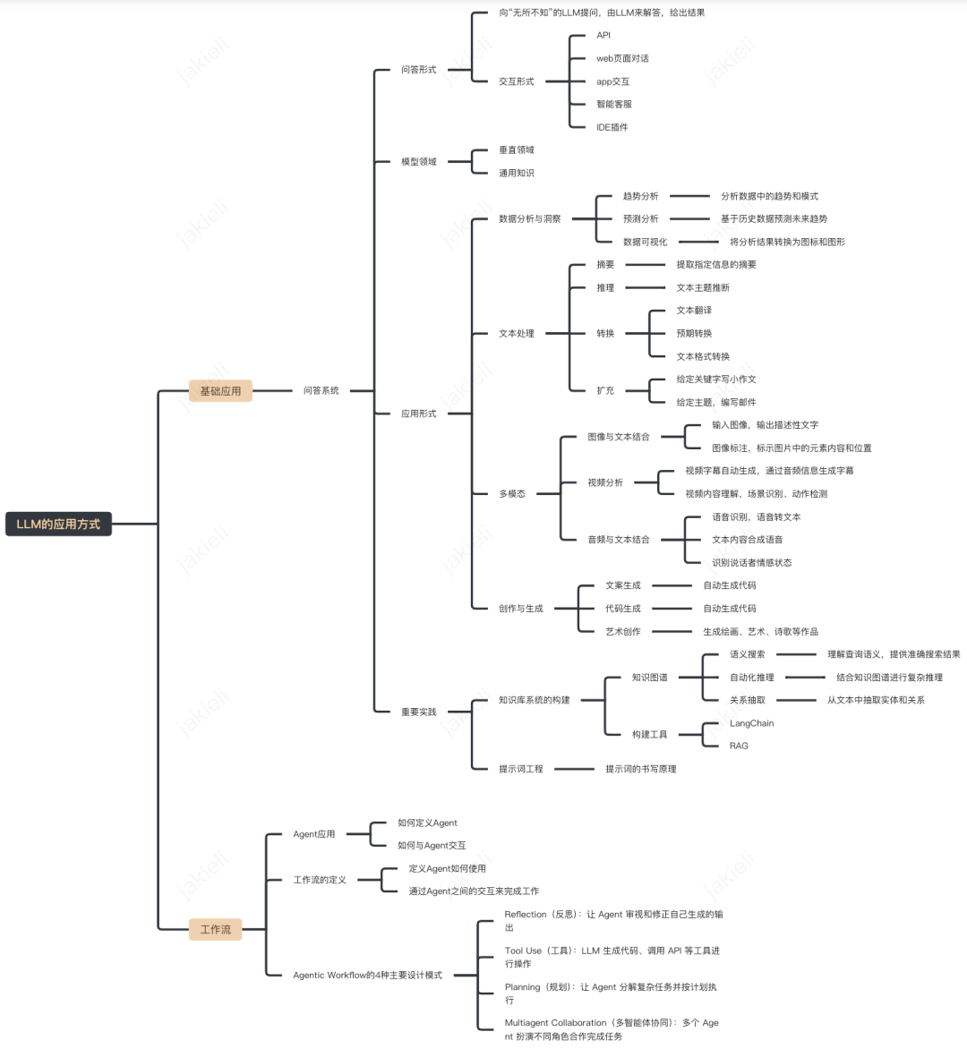 大师兄:你说的不错,不过你说的只是 LLM 应用中很小的一部分(我总结的可能也不合理、全面,欢迎指正)。在我整理的思路中,将LLM的应用可以被看成两种主要的应用,一种我定义为基础应用,一种定义为了工作流的应用。其中基础的应用在我看来基本都可以归纳为:问答系统,即一个向“无所不知”的LLM提问,由LLM来解答并给出结果的一个系统。