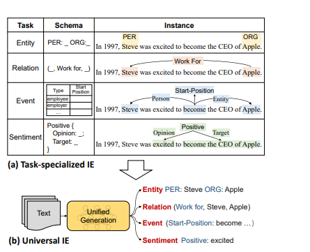 关于信息抽取工具我这里使用的是PaddleNLP的UIE模型,Yaojie Lu等人在ACL-2022中提出了通用信息抽取统一框架UIE。该框架实现了实体抽取、关系抽取、事件抽取、情感分析等任务的统一建模,并使得不同任务间具备良好的迁移和泛化能力。这里大概介绍一下UIE。