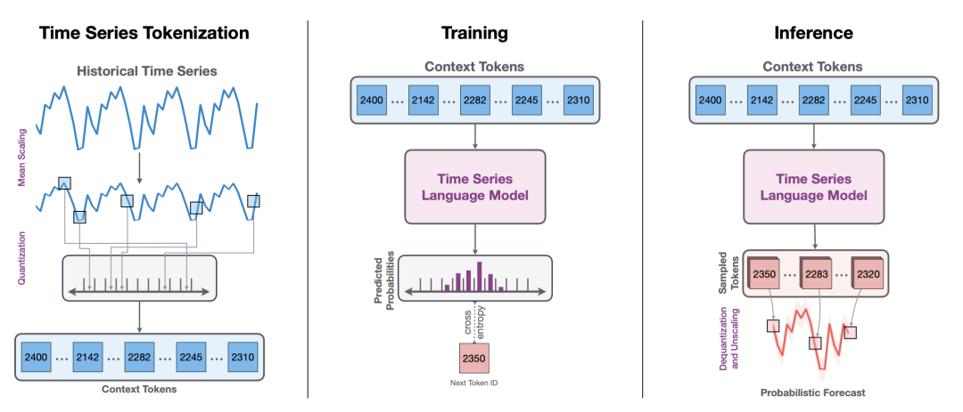 本文提出 Chronos,一个用于预训练概率时间序列模型的简洁而高效的框架。Chronos 通过缩放与量化将时间序列值转换为固定词汇表的标记,并利用交叉熵损失在这些标记化序列上训练现有 Transformer 架构的语言模型。基于 T5 系列(参数规模从 200 万到 7.1 亿)预训练 Chronos 模型,使用大规模公开数据集并结合高斯过程生成的合成数据以增强泛化能力。研究证明,Chronos 模型能利用多领域时间序列数据提升未知预测任务的零样本精度,为简化预测流程提供了可行方案。