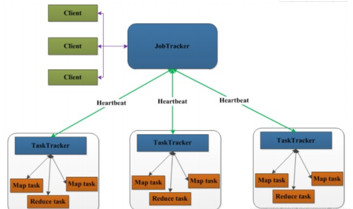 对MapReduce来说,同样时一个主从结构,是由一个JobTracker(主)和多个TaskTracker(从)组成。