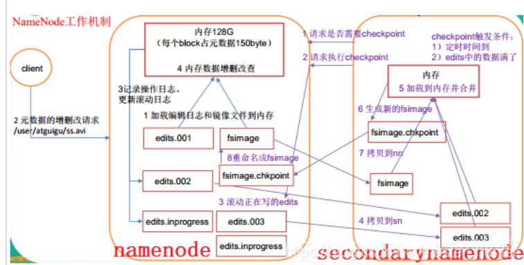 (2).在内存中:映射信息,即文件包含哪些块,每个块存储在哪个数据节点