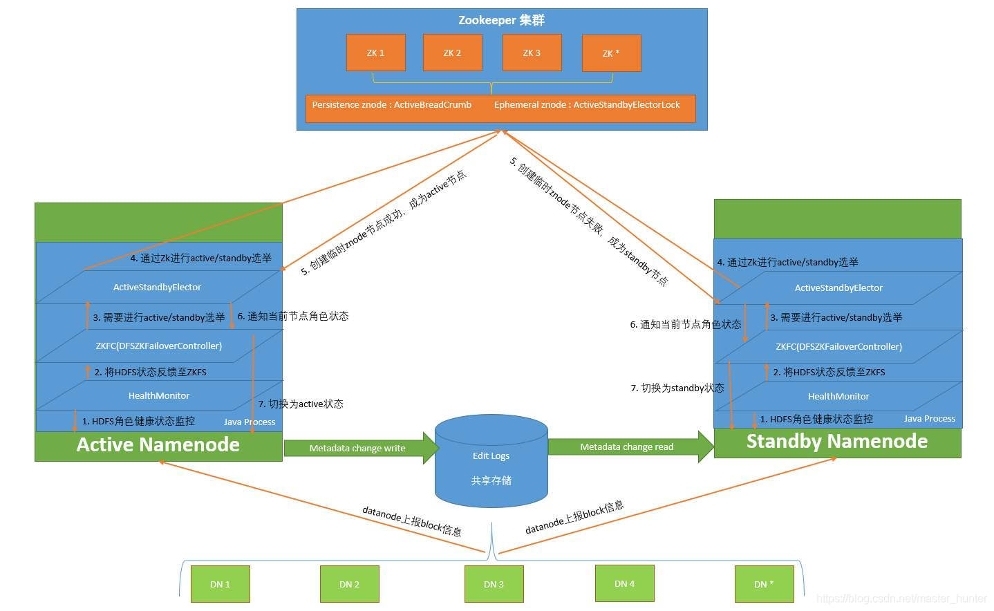 ZKFC:全称是ZooKeeper Failover Controller,这个一个单独的进程,其数量和NN数量一样,负责监控NN节点的健康状态,同时向ZK发送心跳表明它还在工作和NN的状态,如果NN挂了,就可以让ZK马上选举出新的NN(其实就是让standbyNN的状态切换称active),所以ZKFC是NN的一个守护进程,其一般会和其对应的NN部署在同一个节点上。