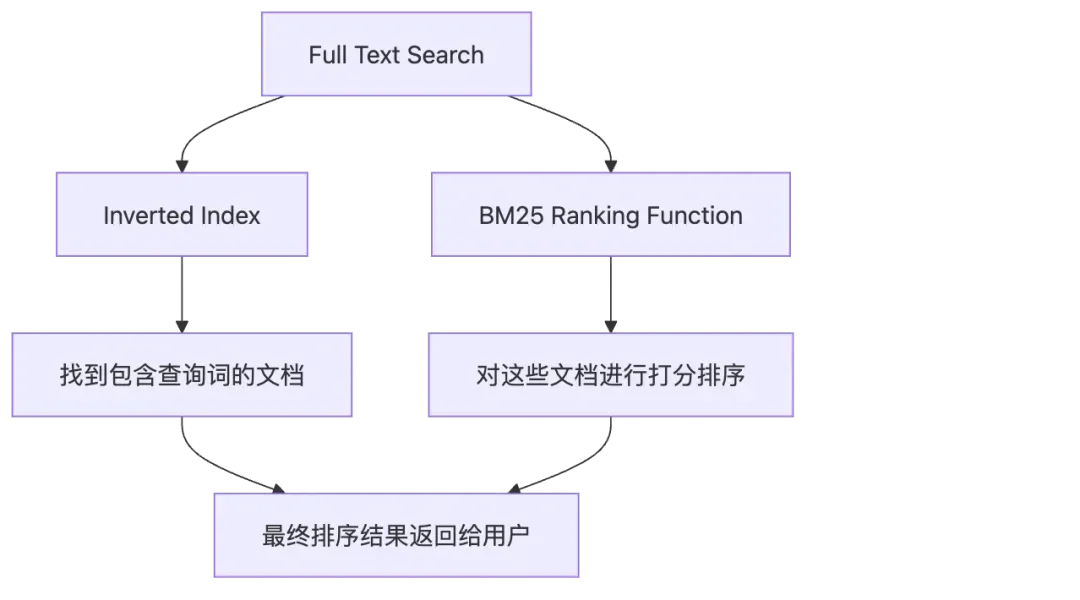 - • BM25:在通过倒排索引找到候选文档后,BM25算法登场,为每个文档计算一个相关性得分,然后按分排序,将最相关的结果呈现给用户。