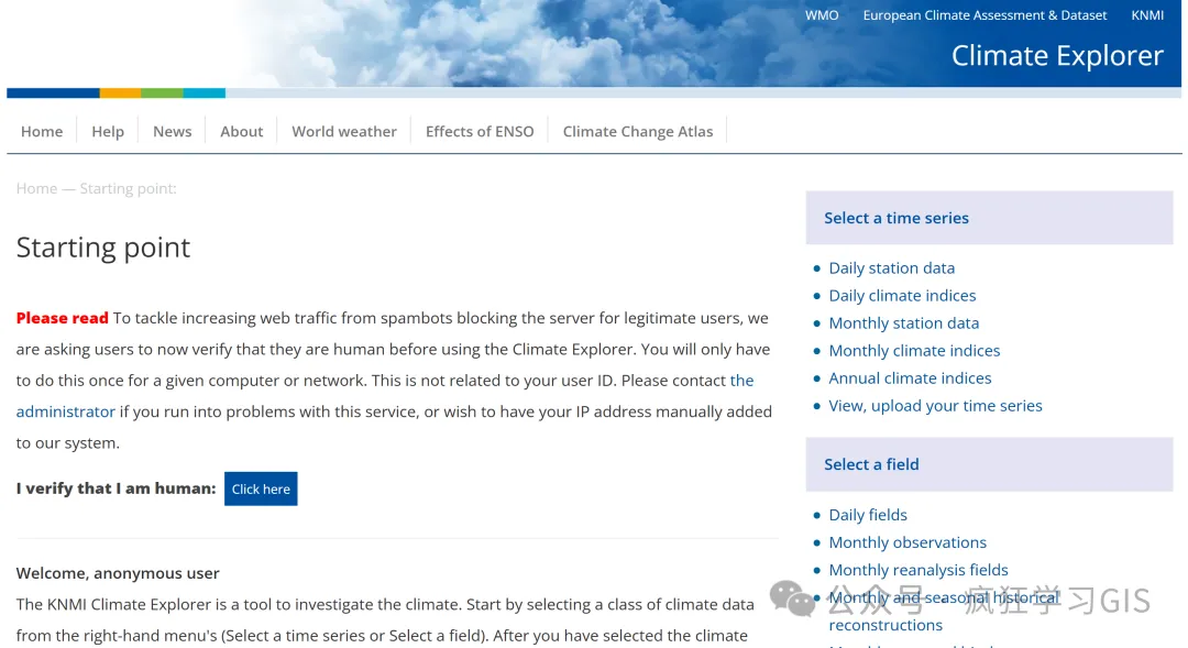 Climate Explorer是世界气象组织(World Meteorological Organization)下属的气象数据检索平台,具有非常丰富的全球或地区气候数据。其一大优势即为可以针对温度、降水、云覆盖等不同的气象要素分别检索,极大提高效率。如下图所示。