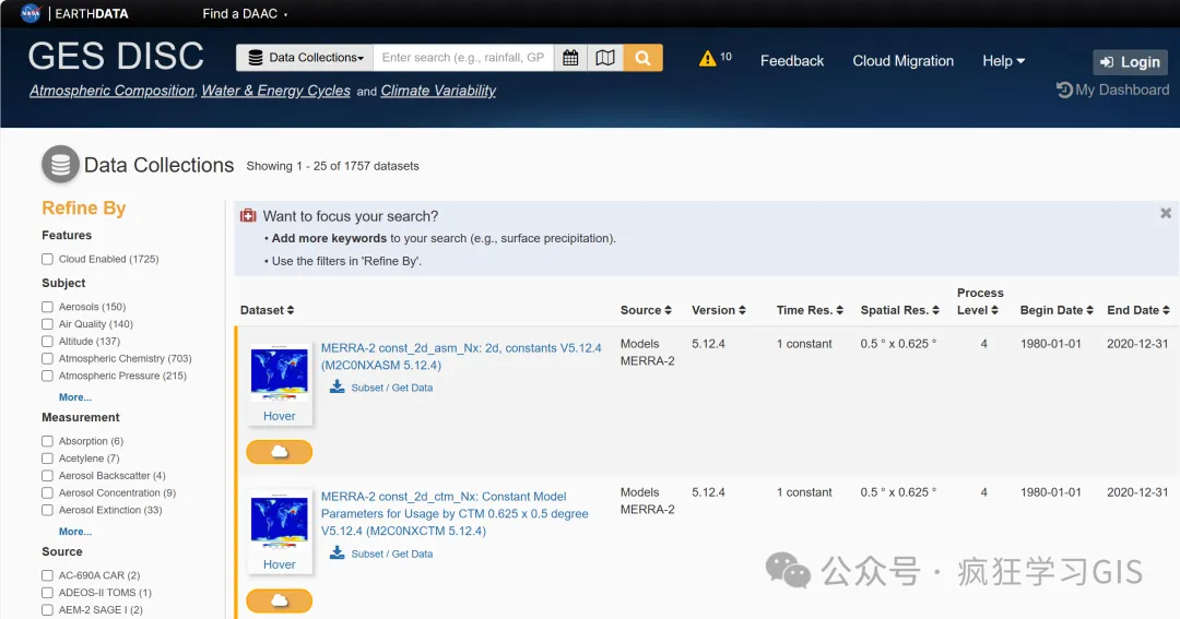 GES(Goddard Earth Sciences) DISC(Data and Information Services Center)是美国国家航空航天局戈达德宇宙飞行中心下属的数据服务中心,具有非常丰富的全球或地区气候、气象数据。如下图所示。