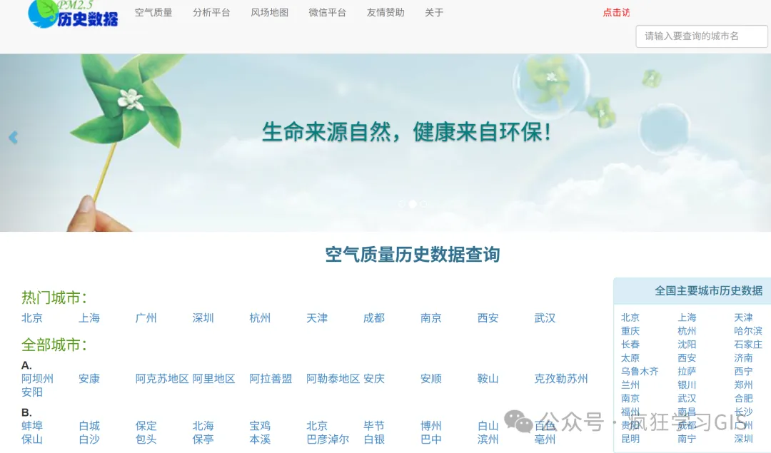 其为中国空气质量在线监测分析平台公布历史空气质量数据的平台,可以依据城市查询相关数据。如下图所示。