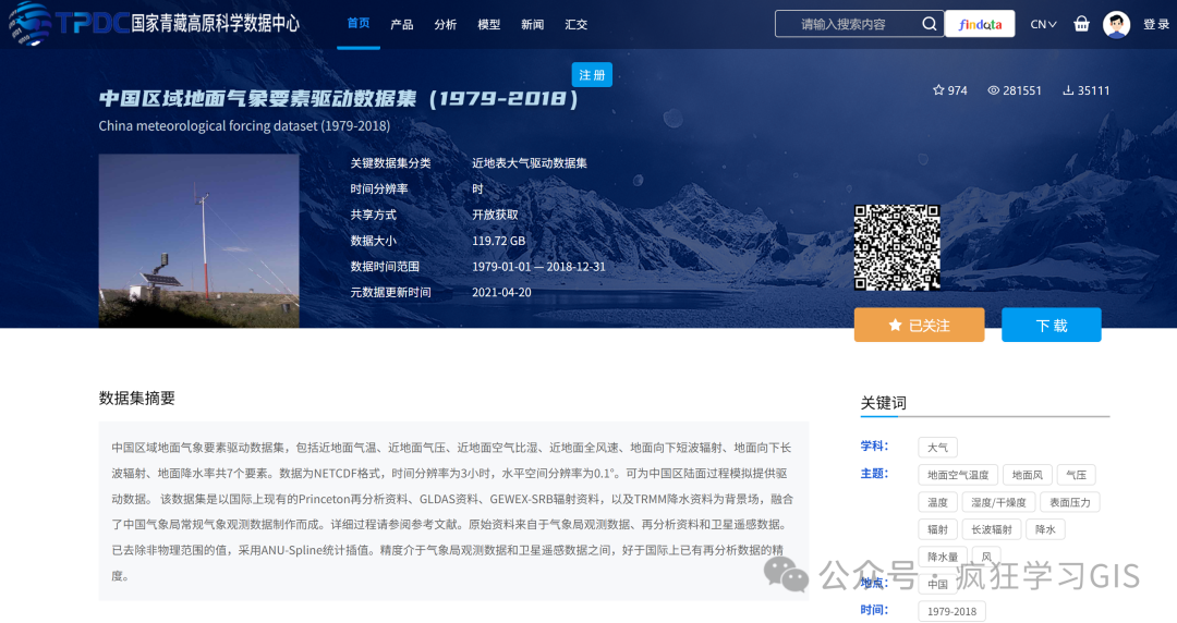 其具有全球大陆地区1958至2015年逐月降水量、最高温度、最低温度、风速、蒸气压、太阳辐射数据,空间分辨率为1/24°;以及全球大陆地区1958至2015年逐月潜在蒸散量、降水量、温度、插值植物可提取土壤持水量数据,空间分辨率为1/24°。但是需要注意,这个网站目前(2025年06月)似乎变成了电脑可访问外国网站才能打开的那种。
