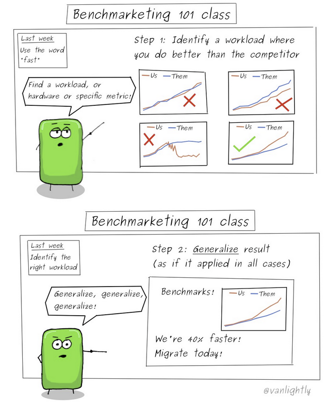 在项目之初,我们需要考虑性能方面的需求。这往往离不开通过使用Apache Kafka、Apache Pulsar和Redpanda,进行概念验证(proof of concept,POC)。注意,不要随意采用有关性能和吞吐量的“基准”。这些基准通常只是针对某个特定问题提供的配置参考。我的同事Jack Vanlightly曾用如下图表,诠释了基准测试的相关概念。您可以参考一下: