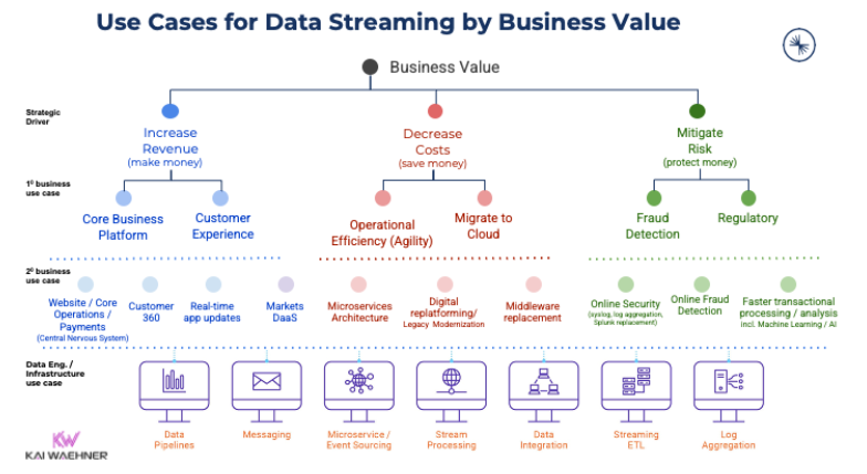 显然,各种数据流的潜在用例和商业价值,是Kafka被采用的曲线能够持续增长的主要动因。而下图则展示了各个行业凭借着Kafka的低延迟、可扩展性、可靠性、以及真正的解耦性等特点,在不同的业务场景中创造的丰富数据价值。