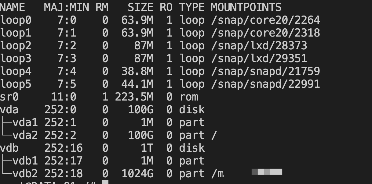 可以看到每个磁盘和分区的详细信息,我们可以根据 MOUNTPOINT 来判断哪些分区已经挂载,哪些分区尚未挂载。