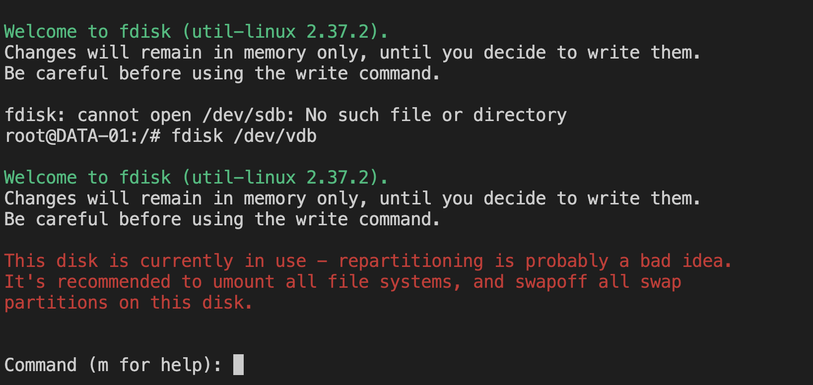 fdisk /dev/sdb返回如下图所示: