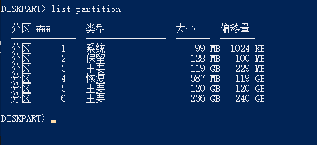 然后,输入 “list partition” 并回车 ,查看所选磁盘上的所有分区。