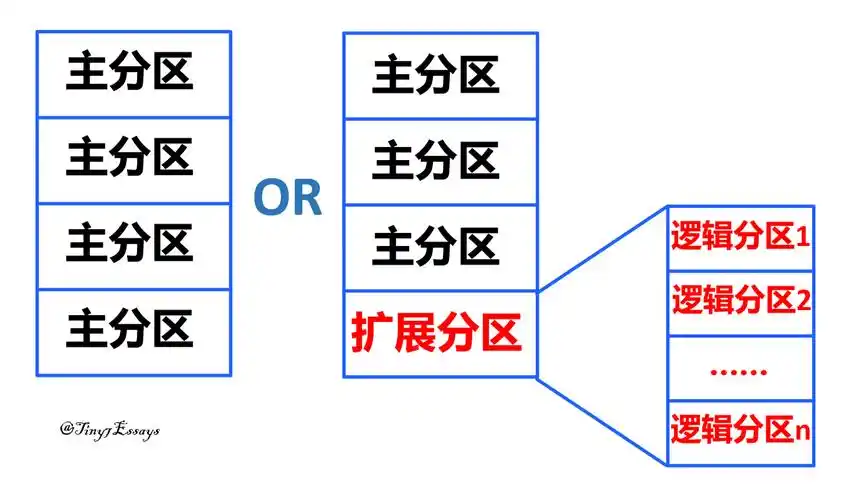 在分区数量上,MBR 和 GPT 也有很大的区别。MBR 最多只能支持 4 个主分区 ,如果想要更多的分区,就需要把其中一个主分区设置为扩展分区,然后在扩展分区里创建逻辑分区。举个简单的例子,MBR 就像是一个只有 4 个房间的房子,如果你想要更多的房间,就只能把其中一个房间再隔出一些小房间(逻辑分区)来。