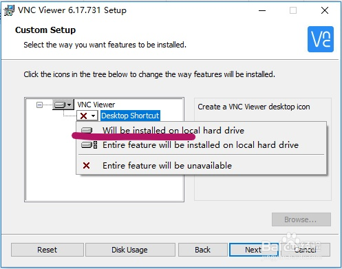 然后选中安装组件中的 Desktop Shotcut,设置桌面快捷方式项,这里默认没有附带,可以单击该项,在弹出选项里选择 Will be installed on local hard drive,就可以在安装完成后自动在桌面创建对应快捷方式。