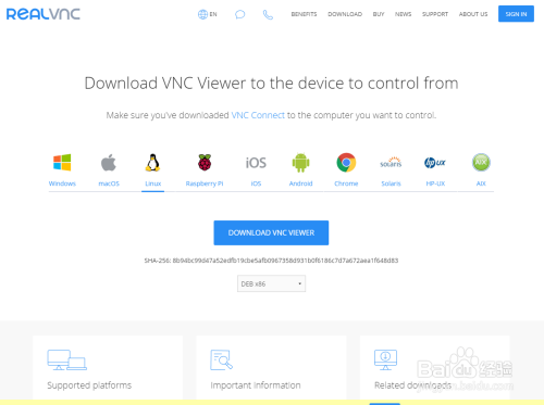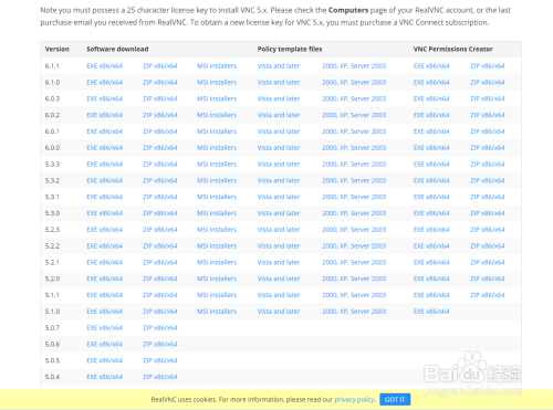 如果你想下载老版本的VNC,可以将下载页面下滚,发现有三个板块:Supported platforms、Important Informations、Related downloads,在 Important Informations 中这一模块中,可以找到一个 Old Versions 项,单击该项即可进入到老版本VNC的下载页面,在老版本下载页面中可以看到之前各版本的安装包资源,可以根据自己的需要选择对应程序进行下载。