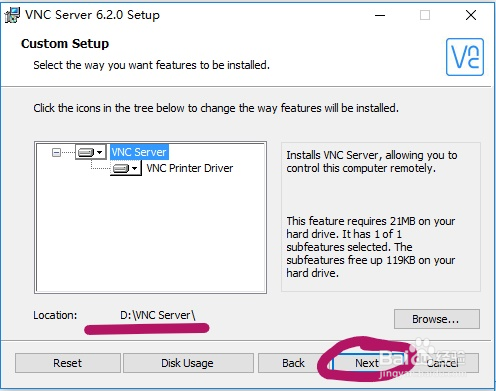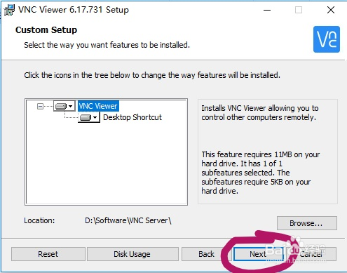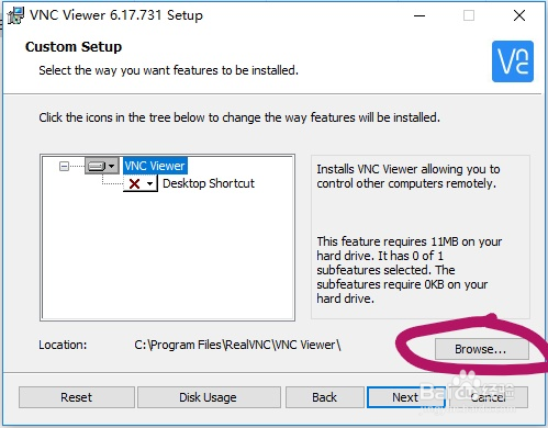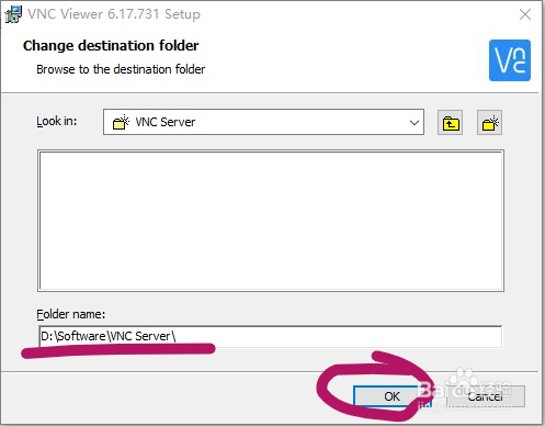 首先选中安装主程序 VNC Viewer,设置安装包的安装路径,点击右下角的 Browse,会弹出路径选择框,选择好自己的安装路径后,点击右下方 OK 即可。