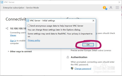 第一次使用 VNC Server时,要进行一些基本配置,安装完 VNC Server后会进入它的主界面,这时会弹出一个首选项,为用户体验反馈设置,这里不要理会,直接点 OK 即可。